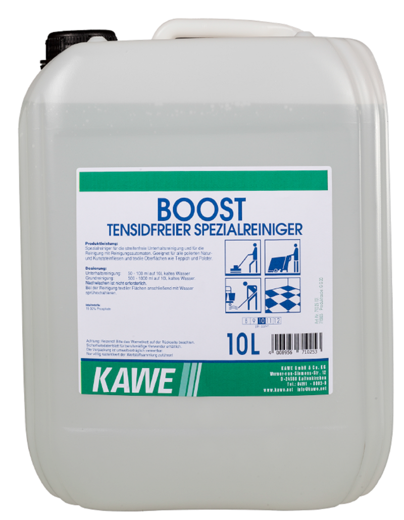 BOOST ist ein Spezialreiniger für die streifenfreie Unterhaltsreinigung, manuell oder mit Reinigungsautomaten. Verringert deutlich die Wiederanschmutzung. Frei von Duft- und Farbstoffen.