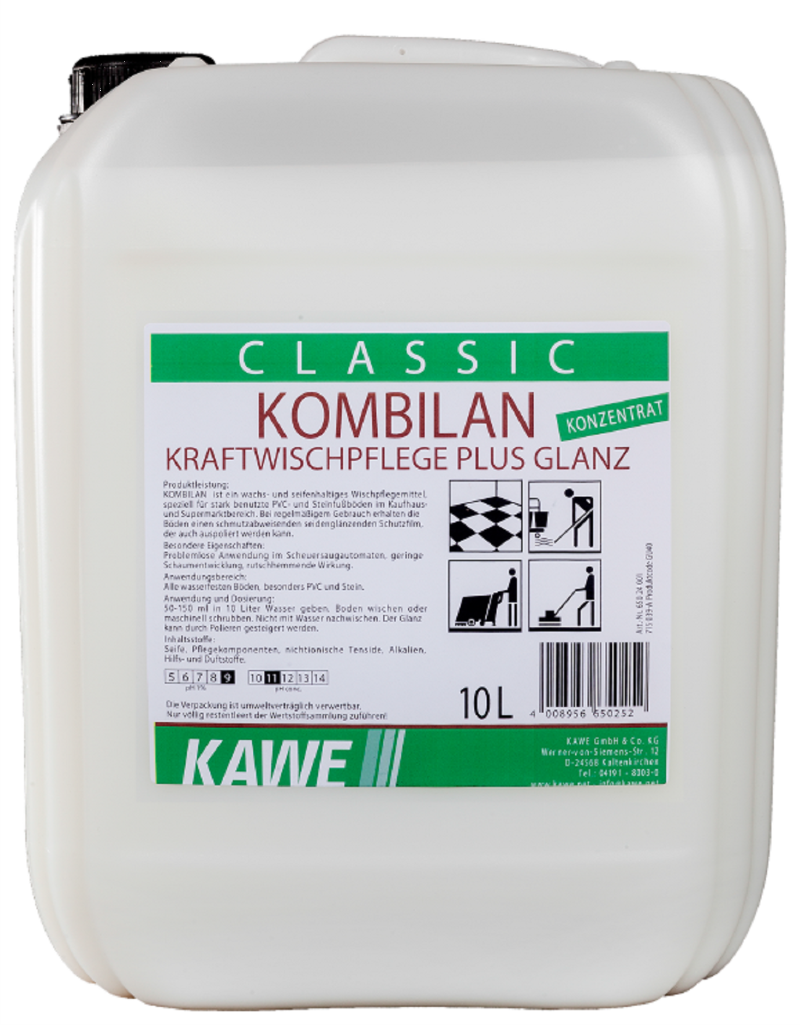 KOMBILAN ist ein wachs- und seifenhaltiges Wischpflegemittel, speziell für stark benutzte PVC- und Steinfußböden im Kaufhaus und Supermarktbereich. Bei regelmäßigem Gebrauch erhalten die Böden einen schmutzabweisenden seidenglänzenden Schutzfilm, der auch auspoliert werden kann.