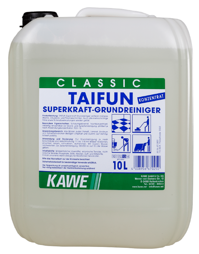 TAIFUN Superkraft-Grundreiniger entfernt mühelos Wachs-, Emulsion- und Polymerschichten. Auch alte mehrschichtige Filme sowie Schmutzverkrustungen werden gelöst.