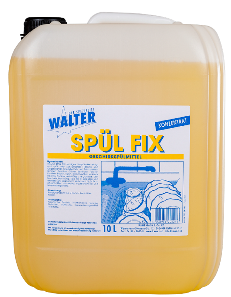 WALTER SPÜL FIX Handgeschirrspülmittel reinigt und spült alle wasserfesten Flächen und Gegenstände. Spezielle Fett- und Schmutzlöser reinigen Geschirr, Gläser, Bestecke, Fenster, Kacheln, Böden, Türen,
